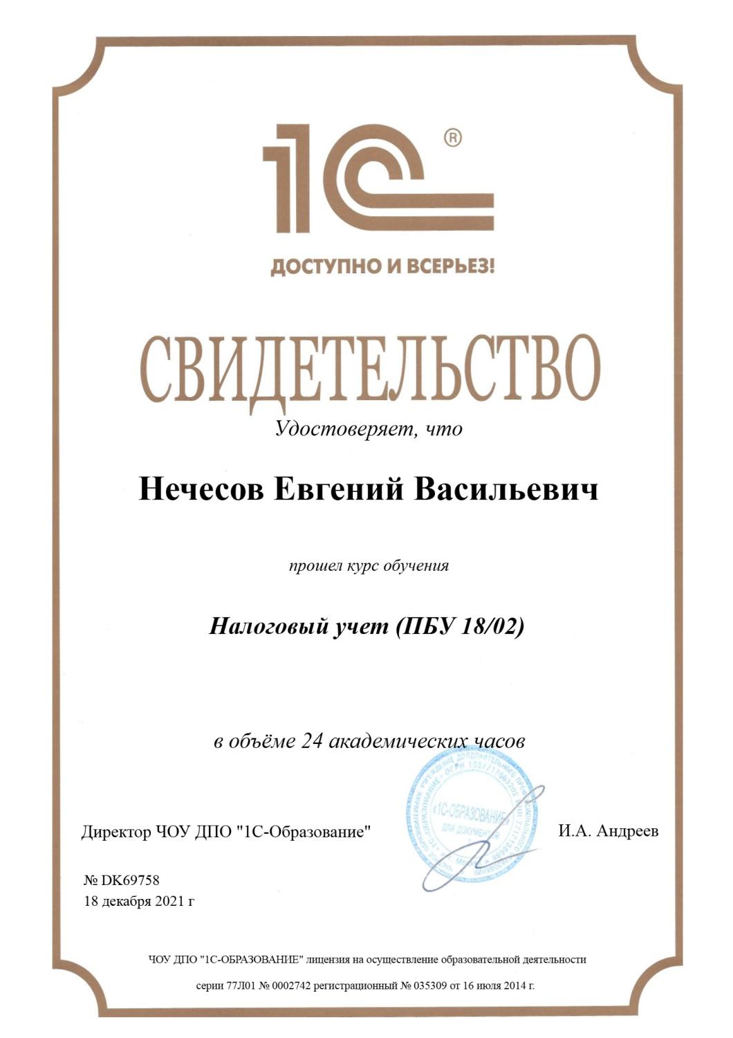 Свидетельство о прохождении курса «Налоговый учет ПБУ 18/02»